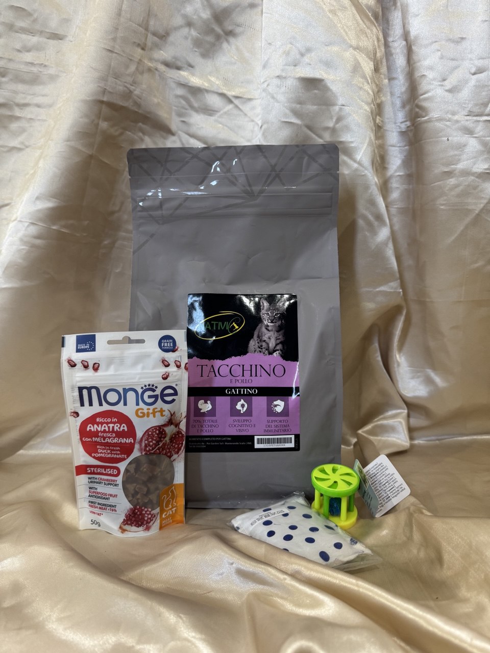 Nel pacchetto prova trovi un sacchetto di croccantini per cuccioli, due giochi e uno snack per il tuo micio.